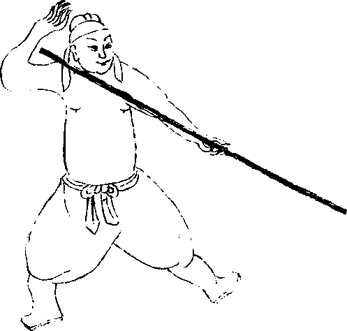 注曰:只手提 棍,哄敌进攻,虚而 有实,勿入套中。彼 忙我缓,以诈称雄, 得心应手,妙用无 穷。