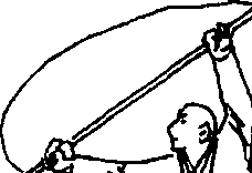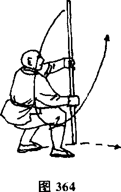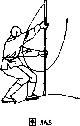 右脚不动,左脚向上半步,两腿微蹲,同时两手握棍反把向 前抡悠,目视前方。(图365)