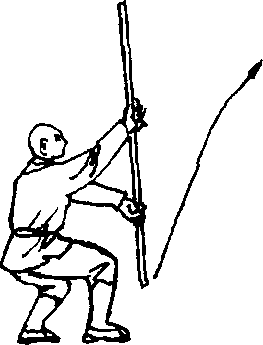 左脚不动,右脚向前上半步,两腿微蹲,同时两手握棍反把 向前悠棍,目视前方。(图366)