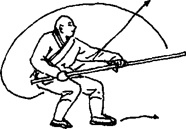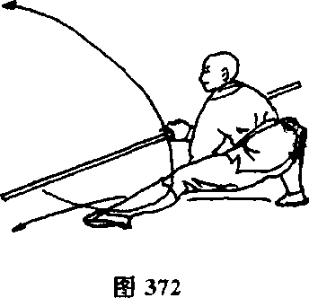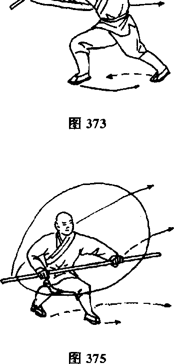 左脚向右脚后外侧移一步,两脚碾地,体左转180\两腿成 左横弓步,同时两手握棍随身后右劈打,然后升左臂,沉右把向 左上方附身悠棍,上体稍向左倾,目视右侧。(图369)