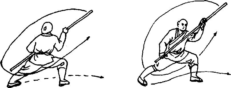时两手倒把握棍随身由左向右拦打,目视棍端。(图375)