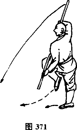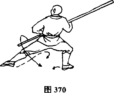 右脚不动,收左脚提膝,同时两手握棍沉把由右向左侧后方 拨棍,目视棍下端。(图371)