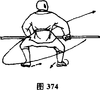 两脚跳起向左翻转180。,两腿成马步,同时两手握棍随身倒 把向前屈肘压棍,目视右侧。(图374)