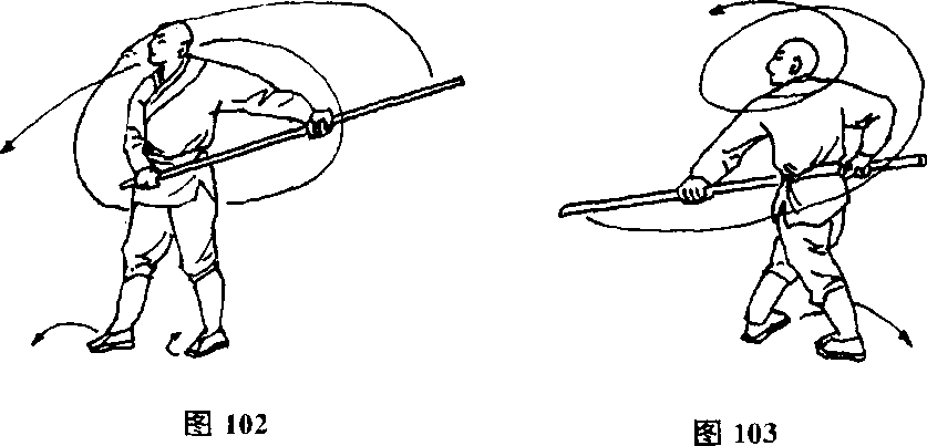 收右脚落左脚前半步,同时两手握棍由前向后绕头抡打,然 后向后摆棍,目视前方。(图102)