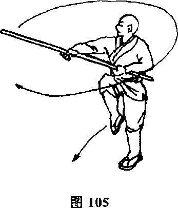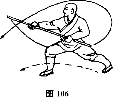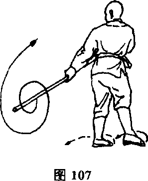 左脚向前上一步,体随之右转150。,同时棍随身抡打,然后 向左侧下方挥棍。(图107)