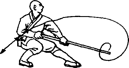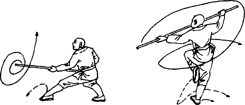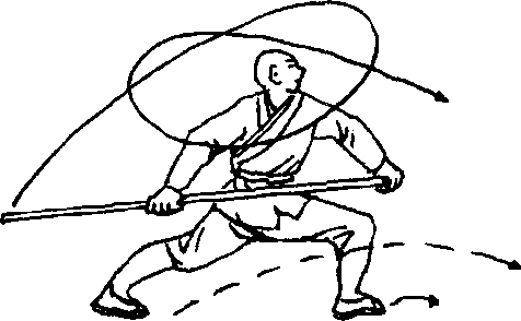 右脚向前落一步,两脚成右弓步,同时两手握棍由前向后轮 打,然后向前刺棍,棍端斜向上,目视棍端。(图1。6)