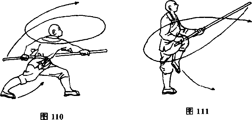 抬右腿向前提膝,同时两手握棍向前往后再返前绕头轮打,然 后滑把前刺,目视棍端。(图111)