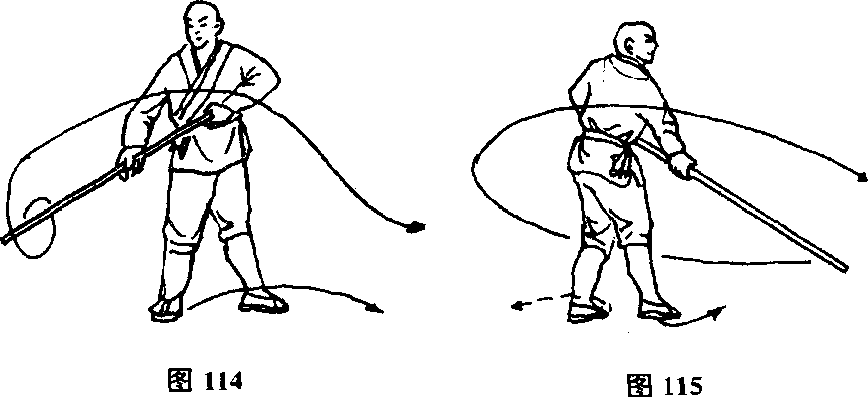 两脚不动,逆绞棍,然后两手倒把,向右侧点棍,目视棍端C (图 114)