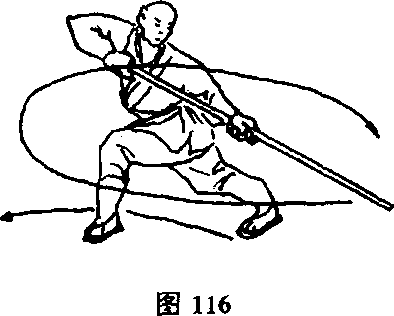 两脚碾地,体左转270。,两腿成大插步,同时两手倒把,随 身轮棍,然后向左侧后下方捣,棍目视棍端。(图116)
