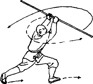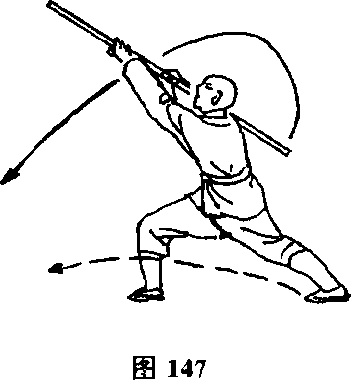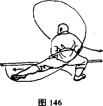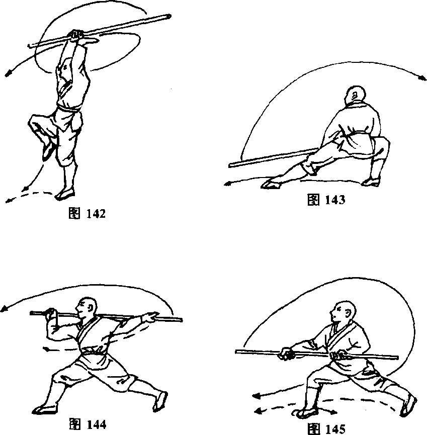两脚不动,两手托棍绕头移于身左侧,两手倒把轮舞花,然 后托棍前穿。(图145)