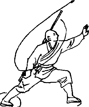 右脚向前踮跳一步,左脚落右脚前,两腿左弓步,棍由前上 轮半圈,然后两手倒把向前横推,上体略向前探,目视棍体。 (图 140)