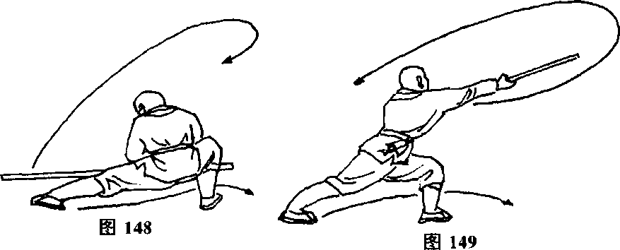 两脚碾地,体右转90。,左脚向前上、步,两腿成左弓步,两 手滑把,握棍由下随身向前连上三步,边上步,边绞棍,目视左 后侧棍端。(图149)