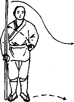 足立八字,右手握棍,竖立右侧,棍梢向上,左手屈肘握拳, 抱于腰间,身胸挺直,目视前方。(图198)