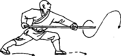 左脚向左开一步,两脚碾地,体左转90°,两腿成左弓步,同 时左手接棍,两手倒把向前刺棍,目视棍端。(图199)
