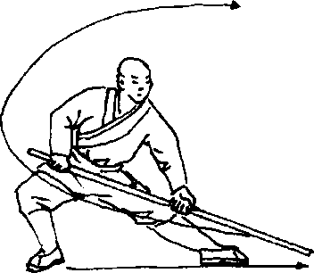 两脚向前跳一步,右脚在左脚前,两脚碾地,体左转90。,两 腿成低势弓步同时两手倒把,向右绕头抡打,然后向右前方劈棍, 目视棍端。(图203)