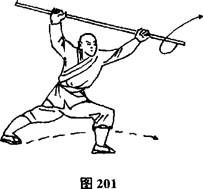 右脚向前上一步,两腿成右弓步,同时向右抡棍,然后两手 滑把向前举臂架棍,棍端斜向前方,目视前方。(图201)