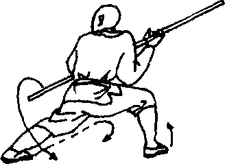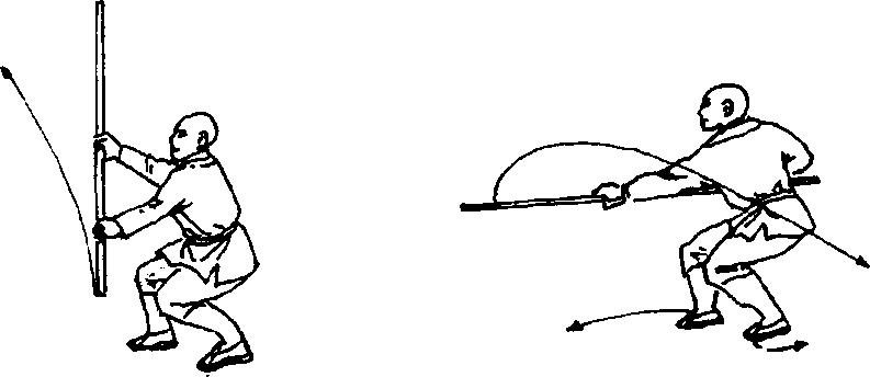 两脚不动,两手握棍由下向前平刺,目视前方。(图341)