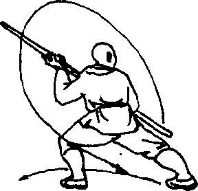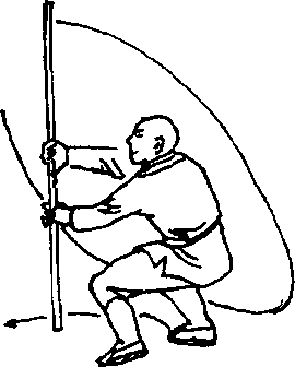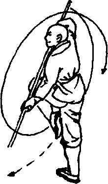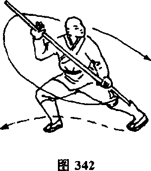 两脚碾地,体右转180°,两腿成左横弓步,同时两手倒把,随 身向右摆棍,然后使棍斜附于身前,向体稍向左倾,目视右侧。 (图 343)
