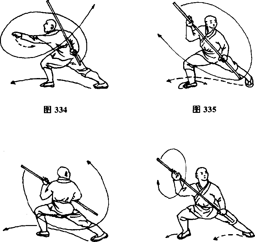 右脚向前上一步,两脚碾地,上体向左拧转180%两腿成右 横弓步,同时右手挽棍由后向前悠打,然后左手接把,两手托棍 随身向右斜附身前,上体向右稍倾,目视左侧。(图335)