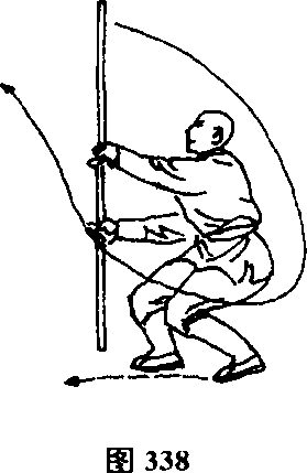 两脚碾地地,体右转90。两脚向前踮跳一步,右脚落左脚前半 步,两腿微蹲,同时两手握棍反把向前悠棍,目视前方。(图 338)
