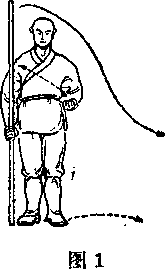 足立八字,右手握棍,竖立右 侧,棍梢向上,左手屈肘握拳,抱 于腰间,身胸挺直,目视前方(图 1 ) 0