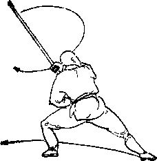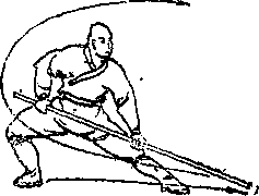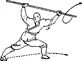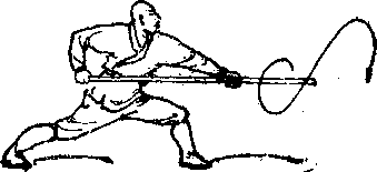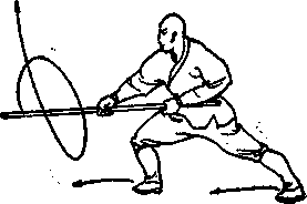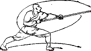 两脚向前跳一步,左脚在 前,同时左手向后滑把向左外 上方拨棍,然后由上向下劈 棍,再反把绞棍,目视棍端 (图 3 )o