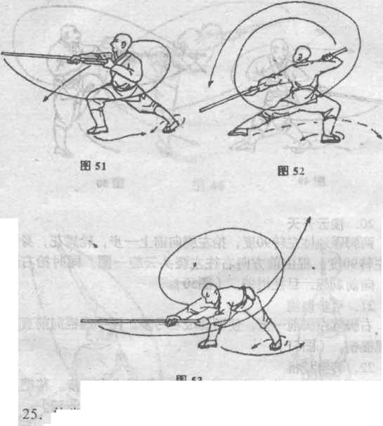 右脚向后退一步,体右转180度,两腿成右弓步。移把,轮 舞花,棍由前朔下,随身向前捣把。目视棍梢。(图52)