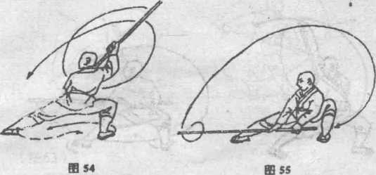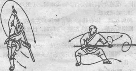 两脚起跳,体右转180度,转体后左腿提膝。半舞花,倒 把,根绕头云旋,然后向左侧下方斜剌。目视棍梢。-(图58 )