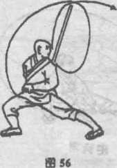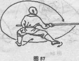 左脚碾地,撤右腿体右转90度,两腿成马步。向外绞棍,然 后倒把,棍随身向右侧劈打。目视棍端。(图57)