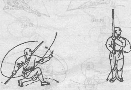 把,向左撩掌,右手抓棍向右轮半花,然后背于右肩背后,目视