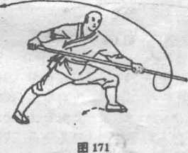 时两手握棍,由左向右绞棍,然后下压,目视棍梢。(图171)