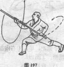 右脚前上一步,两脚成右弓步,同时两手握棍由前向后撩 打,然后倒把托根上挑,棍梢斜向上,目视右侧。(图197)