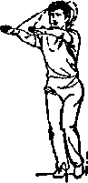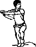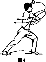 国两掌右移不停,至右侧时前臂外旋屈肘掌心上翻?维线上簟掌心向内绕向头后经左点上变拳向下用力拉于左胸前,同时左、右脚依次用力跺地,两膝微屈眼看右前方(图52
