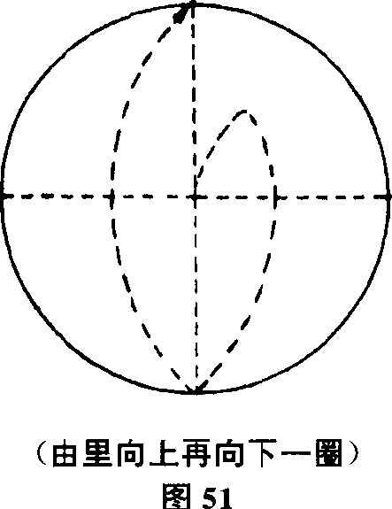 人体的丹田内气通过呼吸、意念的配合在丹田内部做横循环流动以逆腹式呼吸为主。即吸气时以意念向右导引呼气时向左导弓1(图52)。
