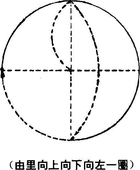 人体的丹田内气通过呼吸、意念的配合在丹田内部做顺时针方向循环流动以逆腹式呼吸为主。呼气时气向左旋转一周吸气时气上提(图53)