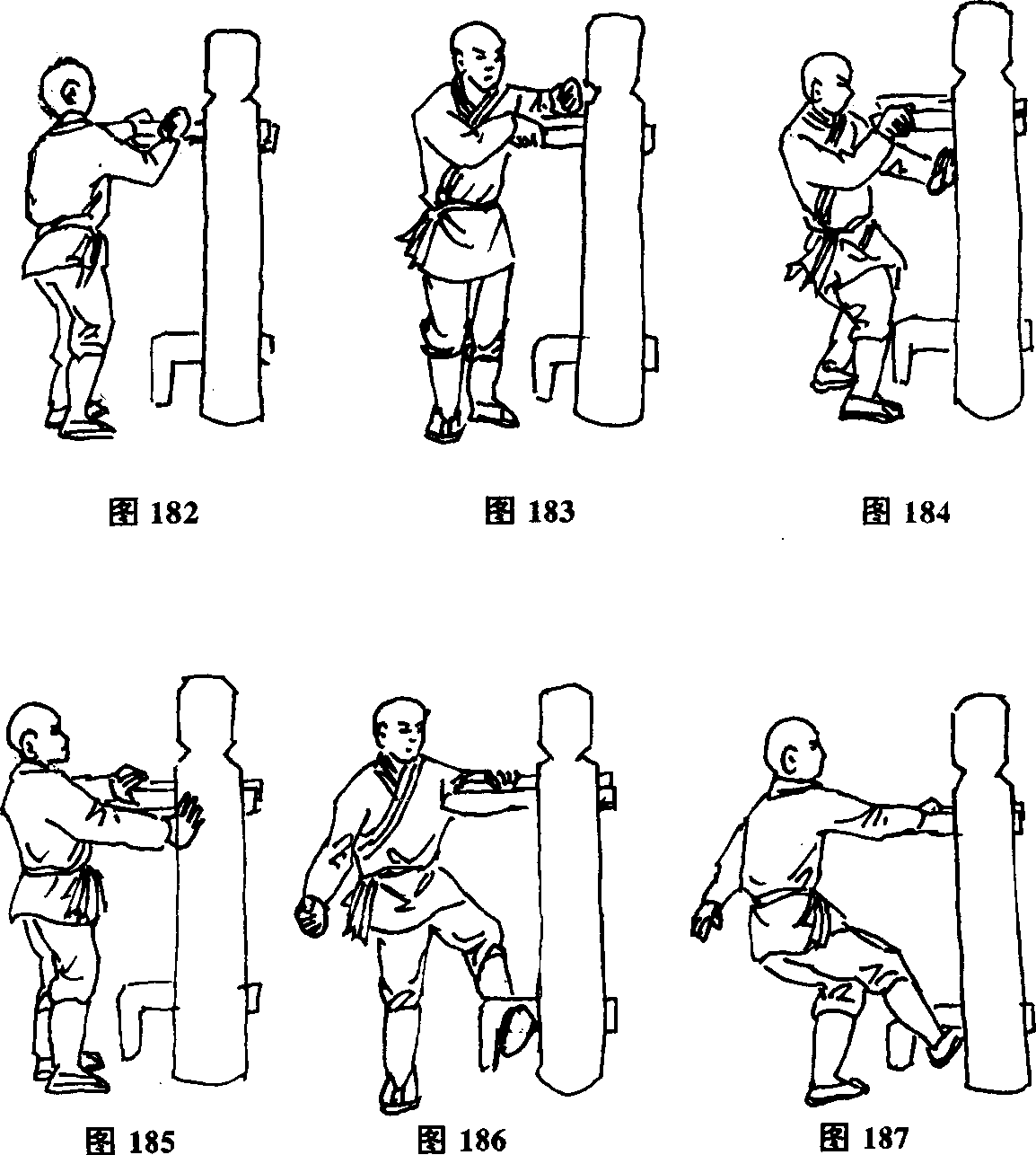 时左手向内搭勾木人桩右侧手臂(图186)