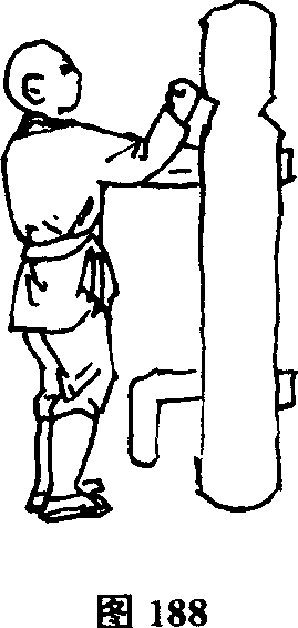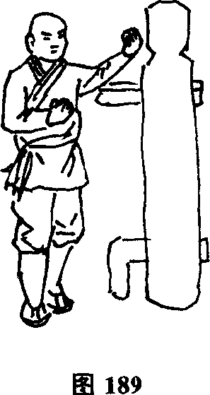 (2)左顶肘崩拳接上势。左脚向前方跨步身体下蹲以左肘顶击木人桩腹部然后身体直起左拳由内向外翻崩木人桩头部(图189)。