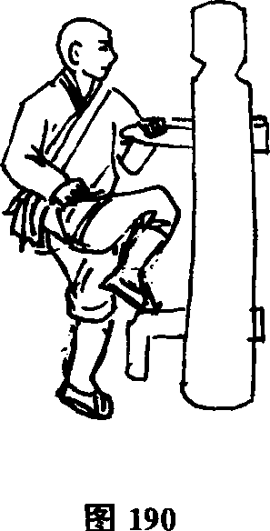 (1)左扣右顶接上势。左手由上向下扣抓木人桩右侧手臂,向怀里带拉同时右腿屈膝上提向前顶击木人桩胸部(图190)。
