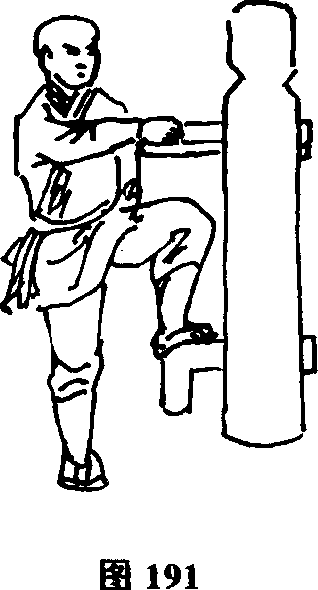 (2)右扣左顶接上势。右手由内向外扣抓木人桩左侧手臂,向怀里带拉同时左腿屈膝上提向前顶击木人桩胸部(图191)。