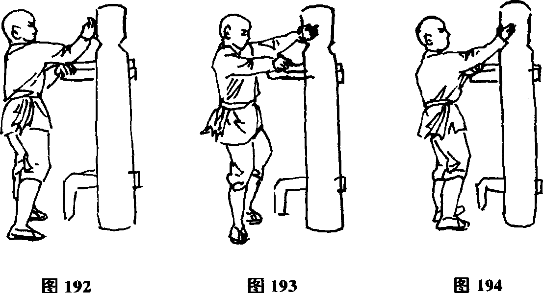 手掌由外向内右手背由内向外挟挤木人桩的右侧手臂。然后左掌成扣手向左拨拉木人桩右侧手臂同时身体稍向右转以右手背抽击木人桩头部(图192)。