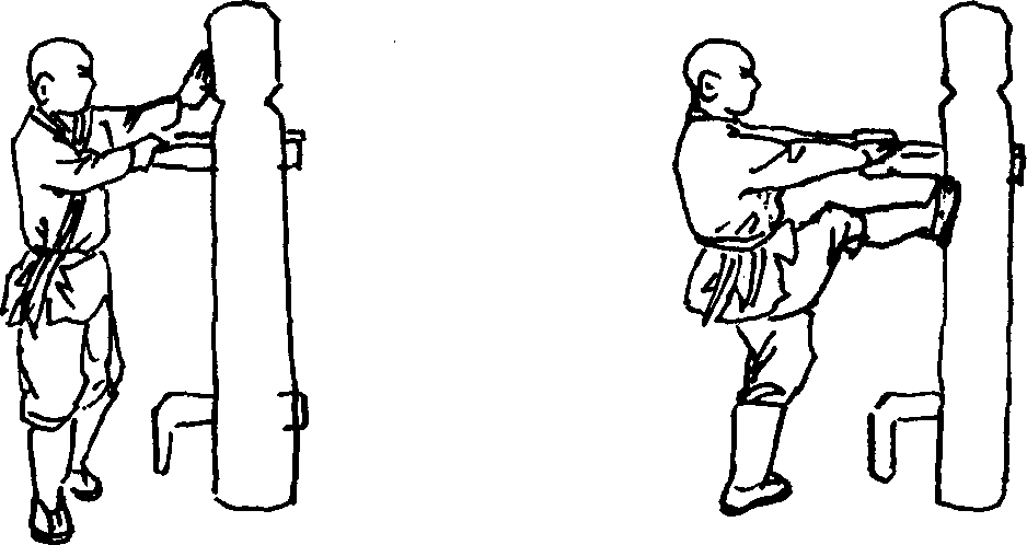 (1)右穿心脚接上势。右手抓握木人桩左侧手臂左手由内向外抓握木人桩右侧手臂双手握桩臂同时向怀里带拉起右脚用力向前蹬踢木人桩胸部(图196)。