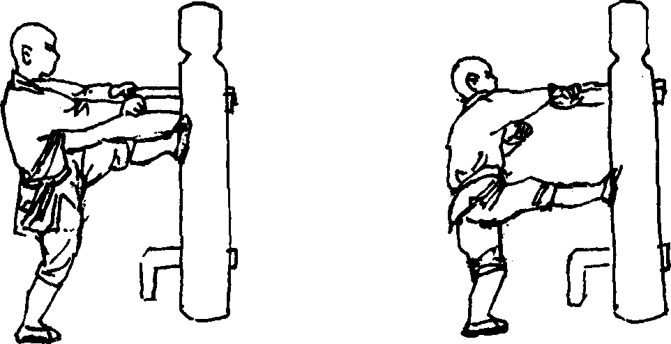 (2)左穿心脚接上势。右脚落回原地起左脚用力蹬踢木人桩胸部(图197)。