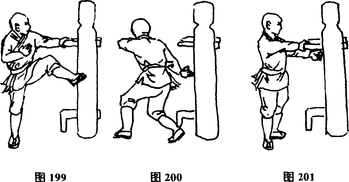 同时左拳乘势向前击打木人桩胸部(图201)。