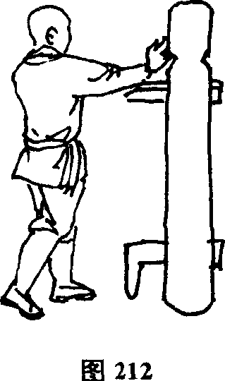 1)右阴阳掌接上势。上体稍向右转右手由内向外以手背抽打木人桩右侧脸部(图212)。上体再由右向左转右手由左侧收回再以掌背打木人桩右侧脸部(图213)。
