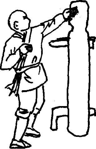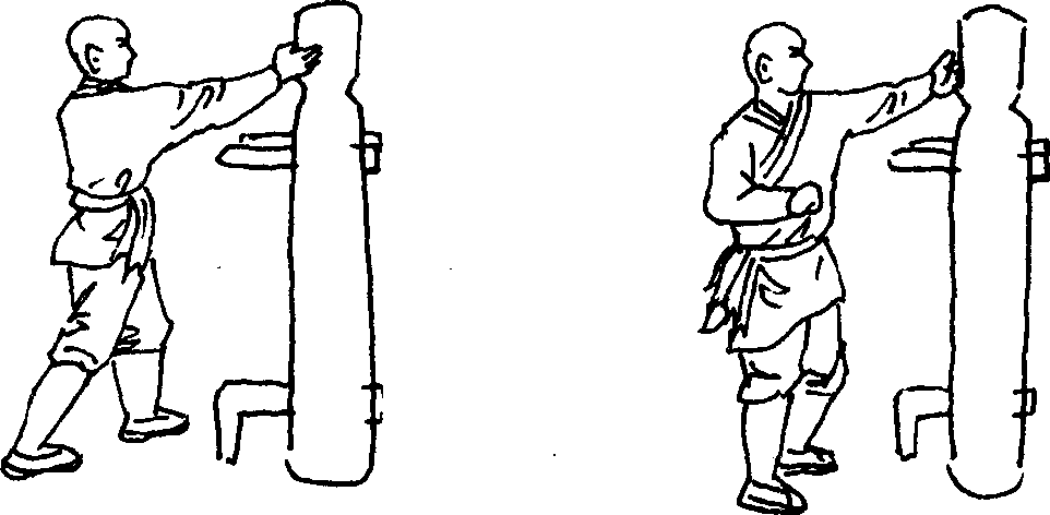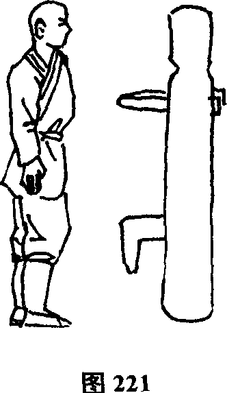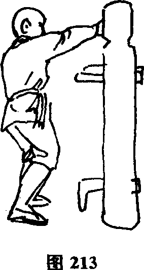 (2)左阴阳掌接上势。上体稍向右转左手由下向上抽打木人桩左侧脸部(图214)。上体再由右向左转左手由左侧收回,再以掌背击打木人桩左侧脸部(图215)。