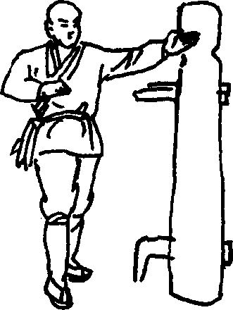 (1)右扇掌接上势。左掌收回抱于腰间右掌从腰间向前扇打木人桩左侧脸部(图216)。
