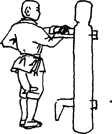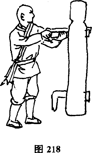 (1)右侧锁手接上势。右手抓握木人桩左侧手臂向外拧转,左手向下插入木人桩左侧小臂根部向上托起双手相对发力(图218)。