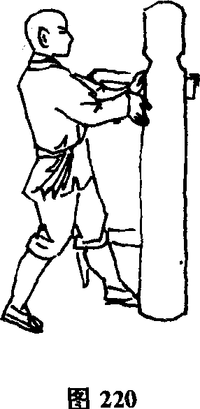 接上势。前脚向前上步后脚紧随两掌由前向后收回至腰间掌心向前再向前推击木人桩胸部(图220)。