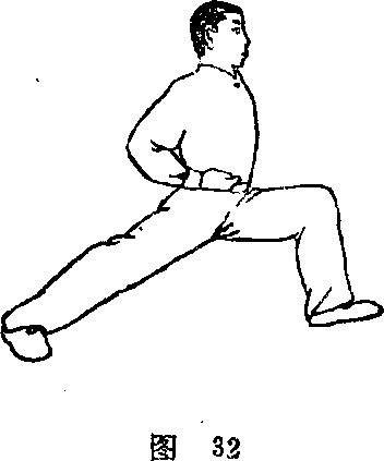 左脚向前一大步(约为脚长的五倍)脚尖稍内扣左腿屈膝半蹲(大腿接近水平)膝与脚尖垂直右腿挺膝伸直脚尖内扣(斜向前方)两脚全脚着地上体对正前方眼向前平视两手抱拳于腰间(图32)。弓右腿为右弓步弓左腿为左弓步。