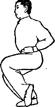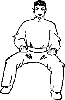 两做平行开立距离(约为脚长的三倍)脚尖正对前方屈膝半蹲膝部不超过脚尖大腿接近水平全脚着地身体重心落于两腿之间两手抱拳于腰间(图33)